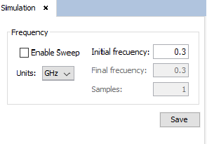 - Frequency: The user can select a single frequency or a frequency sweep to calculate the electrical field. On single frequency simulation, the user will have to introduce the simulation frequency. If frequency sweep is selected, the user will have to introduce the initial and final frequencies, and the number of samples to be simulated in the sweep.