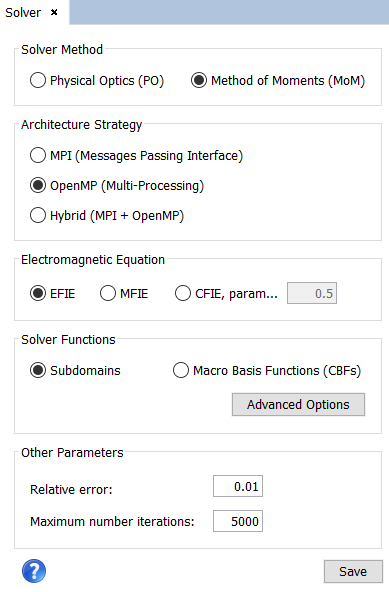 Electromagnetic equation and Solver Functions can only be set when the solver method have been set to MoM. These settings are covered later on its own section.
