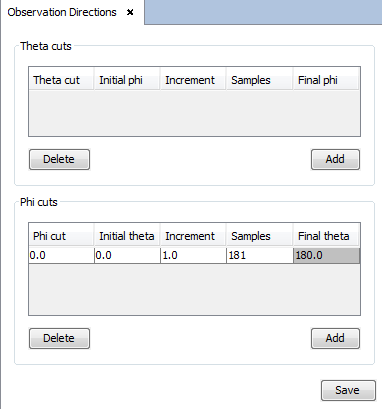 Select Output → Observation directions. Leave the default observation directions (0.0 phi cut with theta angle varying between 0.0 and 180.0 using 181 samples).
