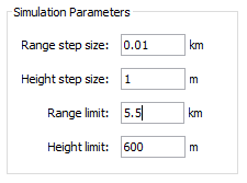 In the simulation parameters, set the range step size to 0.01 km, the height step size to 1m, the range limit to 5.5 km and the height limit to 600. Then save the simulation case.