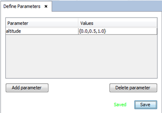 Press the Add parameter button, after which a row appears in the table. In the Parameter column, change the name of the created parameter to “height”, for example. Then change the values to “{0.0, 0.5, 1.0}” and left-click the Save button to save the changes.