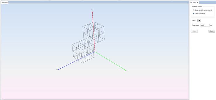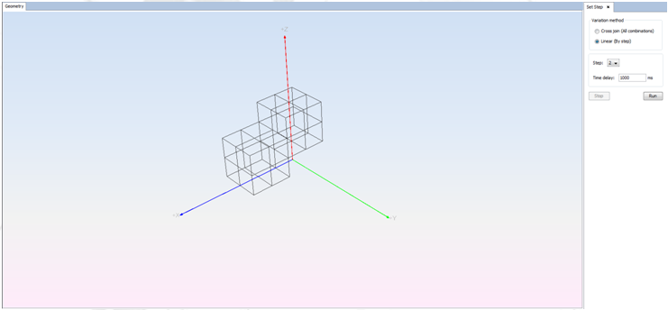 Optional: To see a visualization of each step for the second cube, select the Geometry → Parameters → Set Step. Enable “Linear (By step)”, set the desired time delay between steps, and left-click Run to see the animation on the Geometry View.
