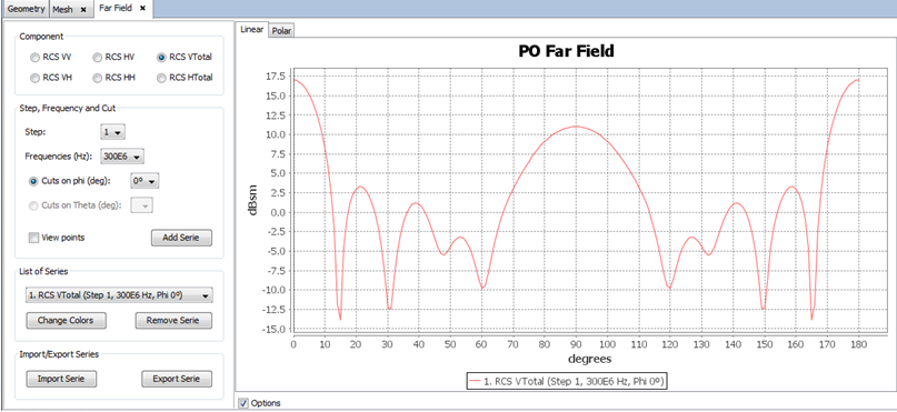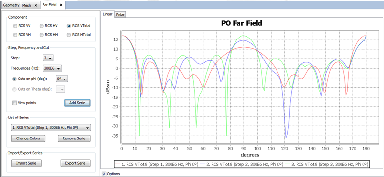 The plot corresponds to the RCS of the first step (when the two boxes share the same Z coordinate). To plot the graphics for the remaining two steps, select “2” in the Step combo-box and left-click the Add Series button. Repeat this procedure to add Step 3 to the RCS graphic.