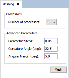 To start the meshing process, the user needs to press the "Mesh" button. This process may take a while (depending on the number of processors selected and the computing power of the computer running the simulation). While it is running, the status of the meshing process will be reported in the process log panel. From this panel we can abort the running meshing process, as well as save the log to a text file.