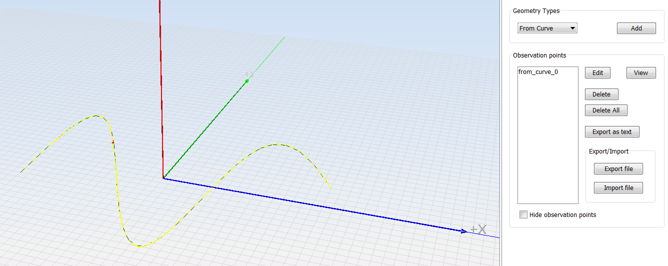 This option lets you select a line or curve of the main panel and sampling it as observation points. Before clicking on the "Add" button having selected the "From Curve" type, the curve has to be selected in the Geometry panel. As shown in the below figure, the following parameters are required: