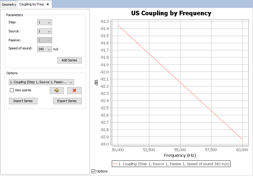 The options "Coupling by Frequency", "Coupling by Step" and "Coupling by Speed" under the Results -> Coupling menu allow the user to analyze the dependency the coupling values have with the frequency, the geometry and the speed of sound, respectively, while keeping the other parameters constant. When selecting one of these options, a panel like the following will be shown: