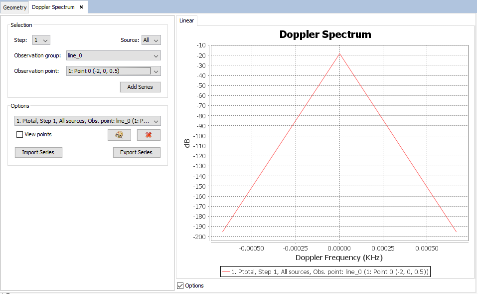 This command plots the Doppler frequency shift computed. Several cuts and frequencies can be plotted in the same graphic. To plot a graph, the user can select the source and observation point. A new graph will be plotted with the button ' Add Series'. In the case that the user has set up a parametrized geometry, it is possible to select the step to visualize the results for.
