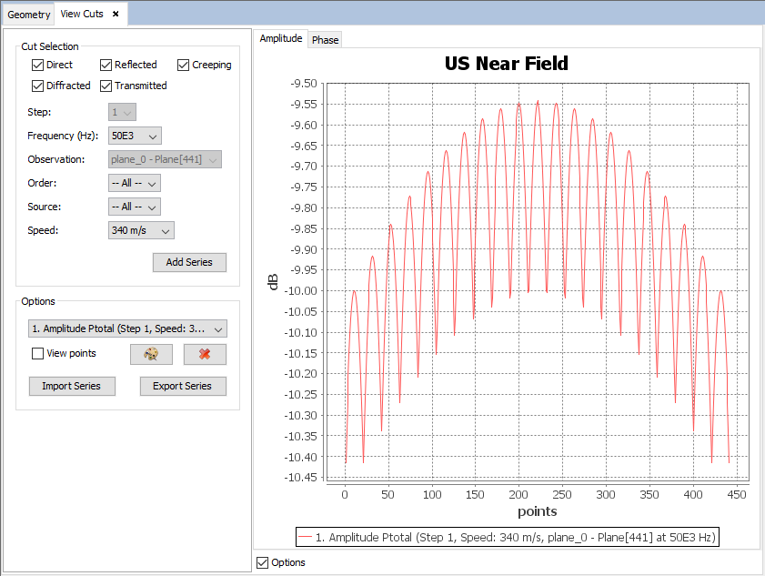 In this panel, the user can select the effects of the rays used to calculate the field, the parametric step, the frequency, the set of observation points, the order of the considered rays, the source and the speed of sound. By pressing the "Add Series" button, a new plot will be added to the panel.