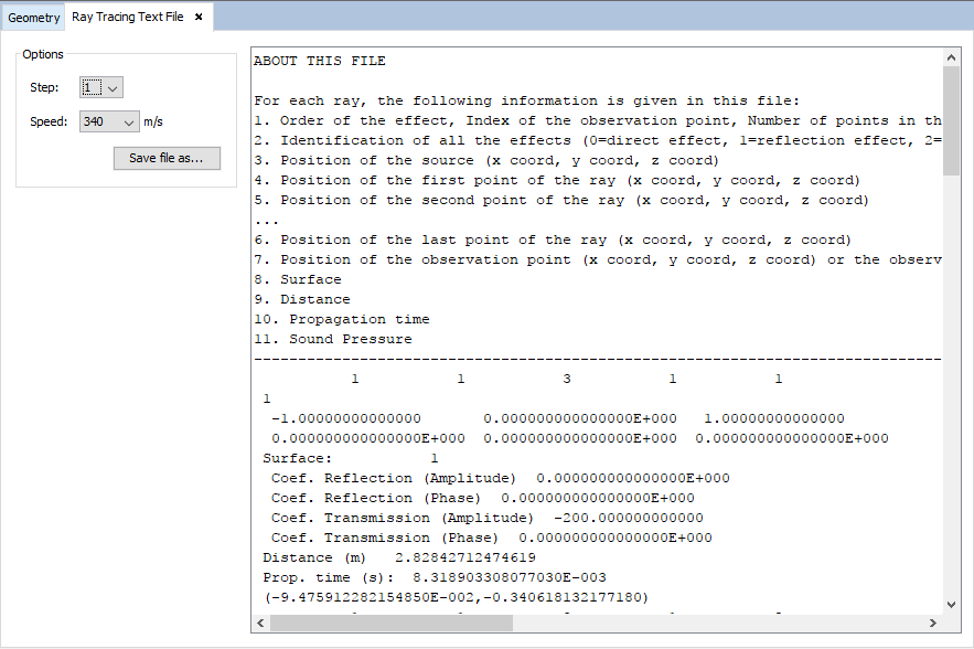 In the left side of the panel, the user can select the parametric step and the speed of sound to show the results for. When any of these options is modified, the text area will immediately show the updated file. The user can export the currently shown file to a location in their hard drive by pressing the "Save as..." button and selecting the location in the dialog that will appear.
