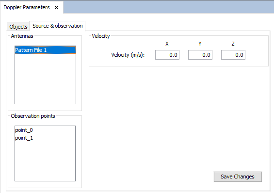 In the "Source & Observation" tab, the user can set Doppler velocities to individual sources and observation points. To do this, the user should select an item from the "Antennas" or the "Observation points" lists and fill the Velocity text boxes with the desired velocity. It is possible to select multiple sources or observation points by holding the Ctrl key and clicking on each source or observation point.