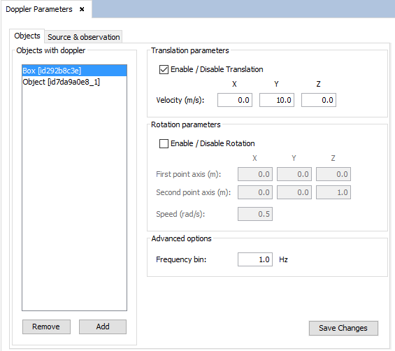In the "Objects" tab, the user can add Doppler effect to objects in the geometry. To do this, select an object from the geometry view and press the Add button. The selected object will be added to the "Objects with doppler" list. It is possible to remove the Doppler effect from an object by selecting it from the list and pressing the Remove button.