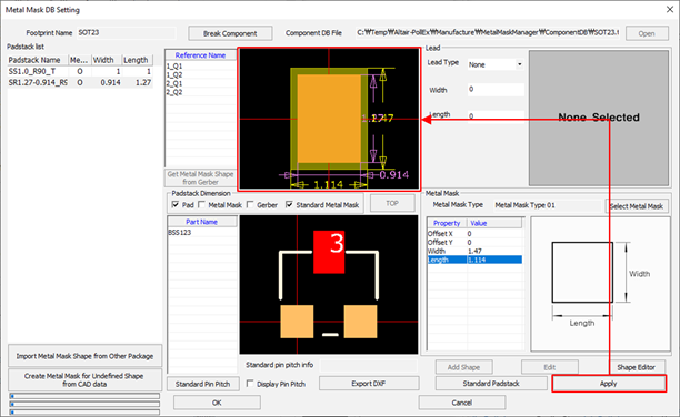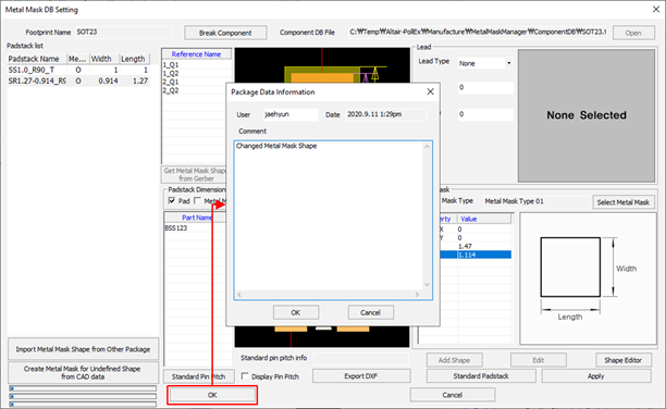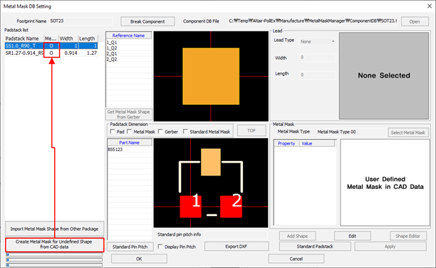 Metal Mask Manager has the function to save standard metal mask shape into database file. So, if components are having same padstacks and they are classified into different type, you can register different standard metal masks for them.