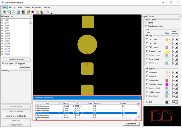 When completed the Clearance Check, the results are displayed in list at the bottom of Metal Mask Manager window. You can save the result as an Excel file by clicking Export Excel.