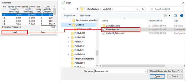 - Select import parameters used when creating the nozzle movement coordinate pattern of the underfill dispenser.