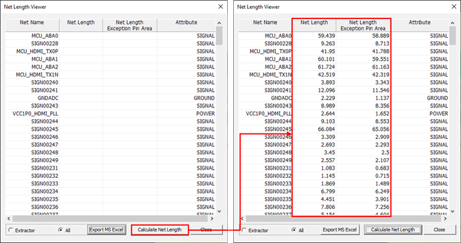 The meaning of Net Length is summation of routing pattern’s segments. But it does not include the copper pour size. Click Export to Excel to make list into MS/Excel sheet.