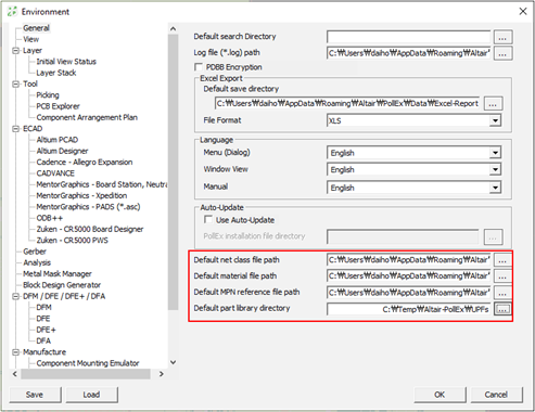 - Default part library directory: you can set default UPF directory path. The UPF contains electrical libraries such as footprints, logical symbols, 3 dimensional shapes, data sheets, simulation model, mount data for electrical/thermal analysis.