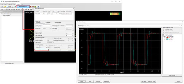 Network Analysis menu under Analysis allows you to analyze the net topology analysis model in time and frequency domains to obtain the transient waveforms, eye diagrams, and frequency-dependent network parameters which are different views of the signal delay and distortion. Before analysis you can select an analysis type among Waveform, Eye Diagram, and Network Parameter and edit the input signal, device model selection, and analysis control parameters.