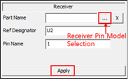 1. Receiver Pin: Can add any numbers of receiver pin model to the selected topology. And can assign Part Name and Pin Name by clicking menu below. Click the desired Part and Pin names and click OK in the Select Part/Pin dialog.