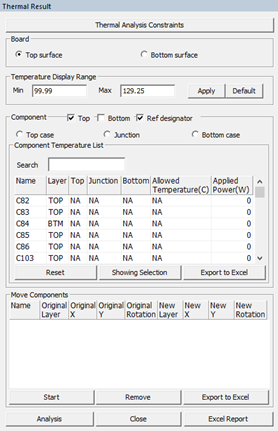 Thermal Analysis Constraints: Use this menu button to go back to Thermal Constraints Setting dialog. After changing constraints, click Analysis to re-run thermal analysis.