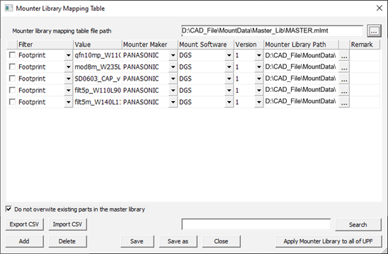 5. Do not overwrite existing parts in the master library: When checked, do not overwrite the mounter library file if the same part already exists in the master library.