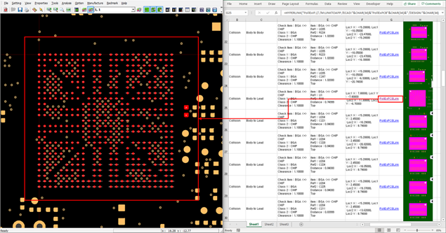 When you export a DFA result to Excel, you can export a hyperlink that links to a PollEx PCB. When you click the hyperlink on the Excel report, a violated area or object is displayed in the PollEx PCB design data. You can cross-probe between the PollEx PCB and the Excel report. You can set the cross-probe with an Excel report in Step 4 in the User Defined Excel Format.