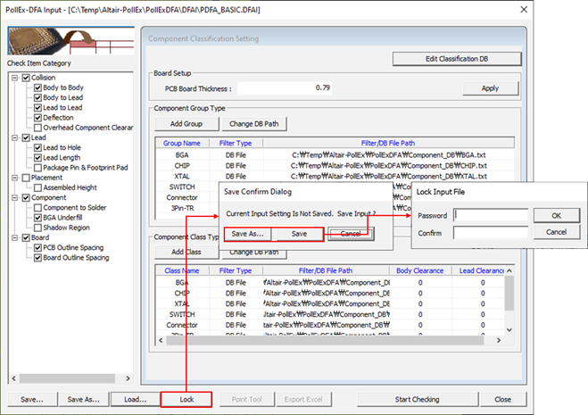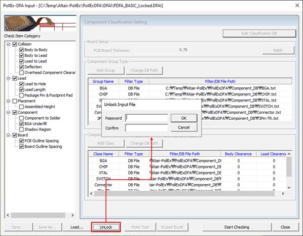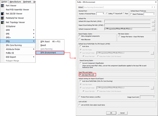 DFA input rule file (*.DFAI) can be locked to prevent any modifications from users. The purpose of the input file encryption is to keep a uniform set of rules throughout without tweaking them for certain application once the input setup is done by a designated person. Locked DFA input file can be used to verify a PCB design and only tweaked by the designated person.