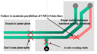 To design a Differential Pair Net, you must pay attention to keep the continuity of power and ground planes above and below of the differential net. Do not make branch stub to make test point. In other words, impedance for overall routing must be kept the same for the pair nets.