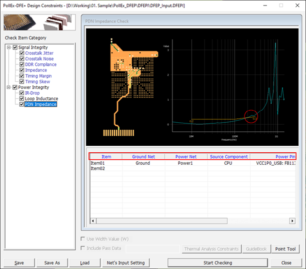 This item checks whether the PDN impedance of the specified Power Pins are higher than the target impedance specified.
