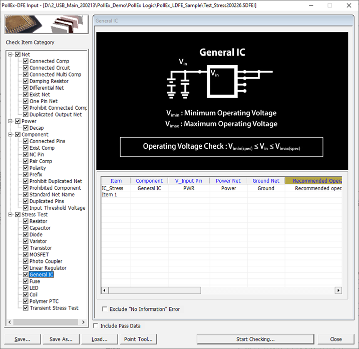 This item tracks the voltage and signal lines in the circuit, calculates the voltage value of each net, and checks whether the all general IC connected to the net is within the allowable voltage range.