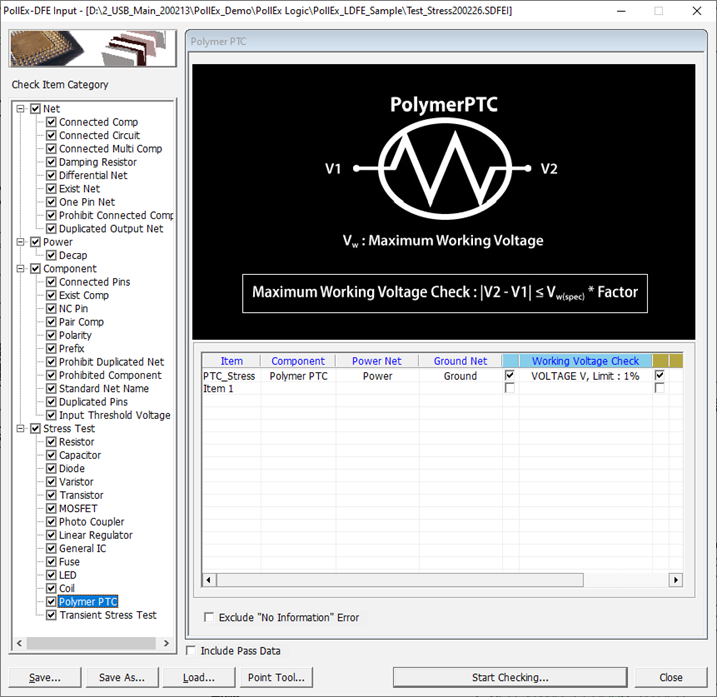 This item tracks the voltage and signal lines in the circuit, calculates the voltage value of each net, and checks whether the all polymer PTC connected to the net is within the allowable voltage range.