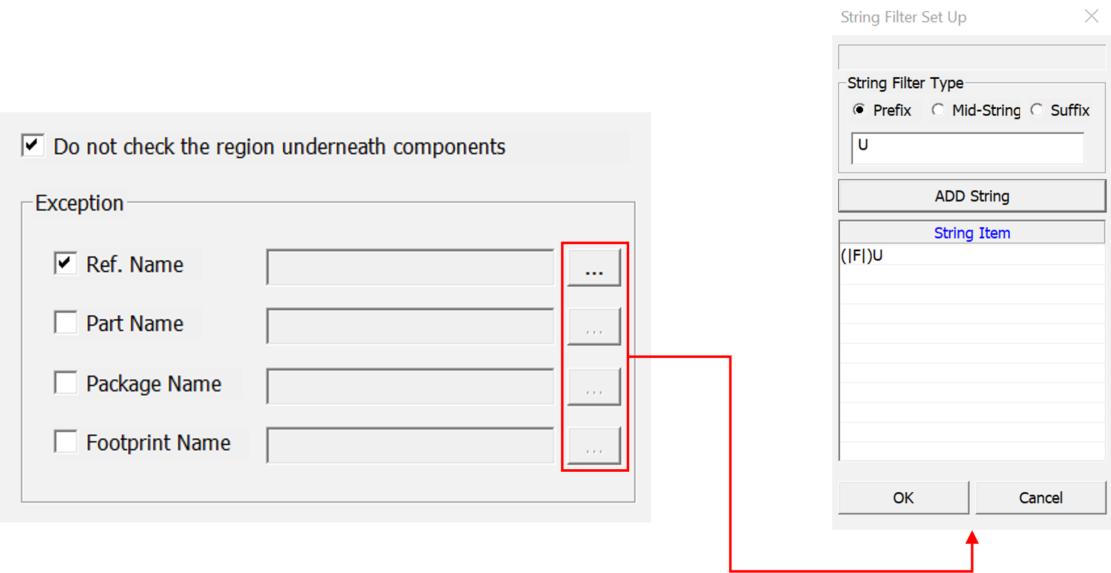 - Exclude analysis for pins in a component - This option excludes the pin and pin areas within the component from analysis.