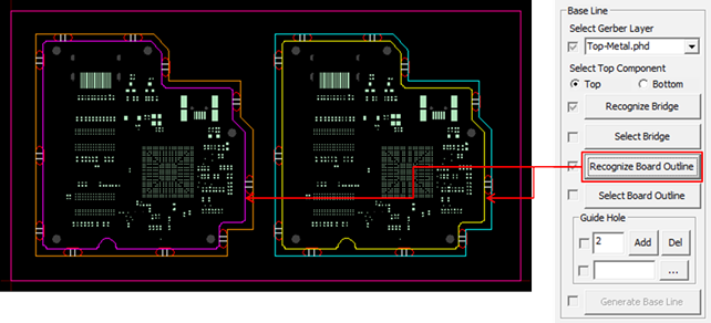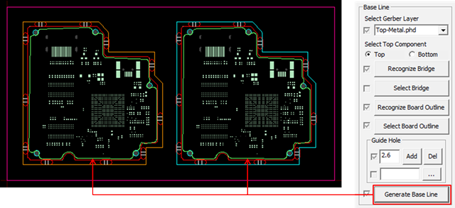 The selected unit PCB outline is highlighted in red and is the basis for creating the base line.