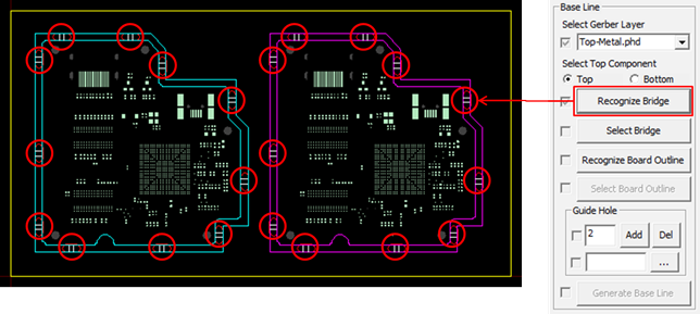 The line corresponding to the bridge is automatically searched. The recognized line of the bridge is displayed in white, and the vacuum hole is in red.