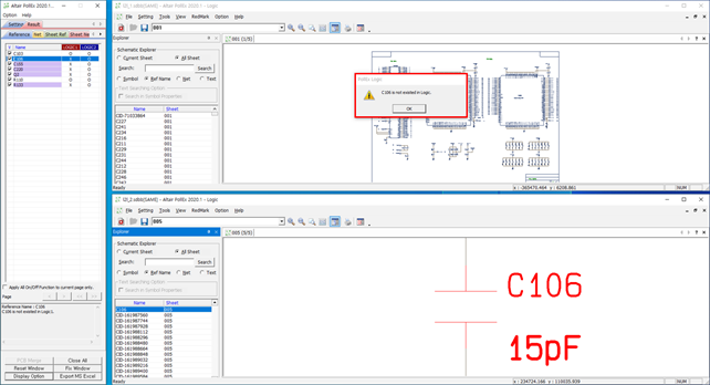 C106 exists in PCB design only. In the LOGIC window, there is no C106.
