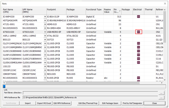 The Electrical & Thermal Properties dialog opens. The connector’s part properties are assigned automatically, as shown in the Electrical & Thermal Properties dialog.