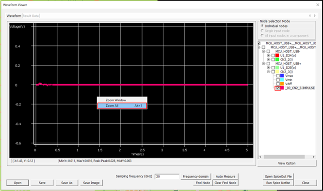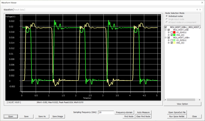 When the waveform analysis starts, electromagnetic simulation extracts the SPICE model for the selected net. The excitation source signal is applied to the net which is specified by the assigned pin model’s operating characteristics and the values defined at Input Signal and Pulse Period. When the simulation is done, the Waveform Viewer opens or exploring the waveforms.