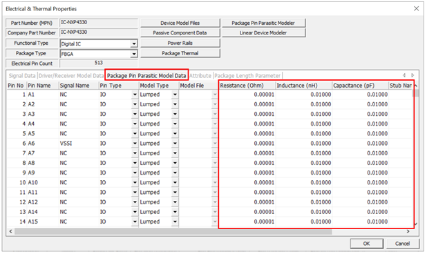 Figure 8.This is the Package Pin Parasitic Model Data tab menu. The parasitic values in the red box vary depending on the IBIS model.