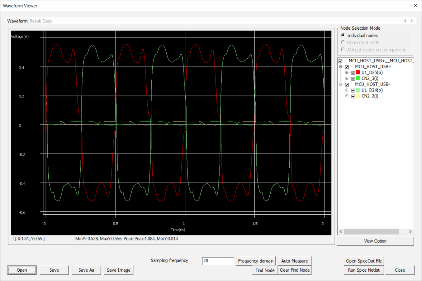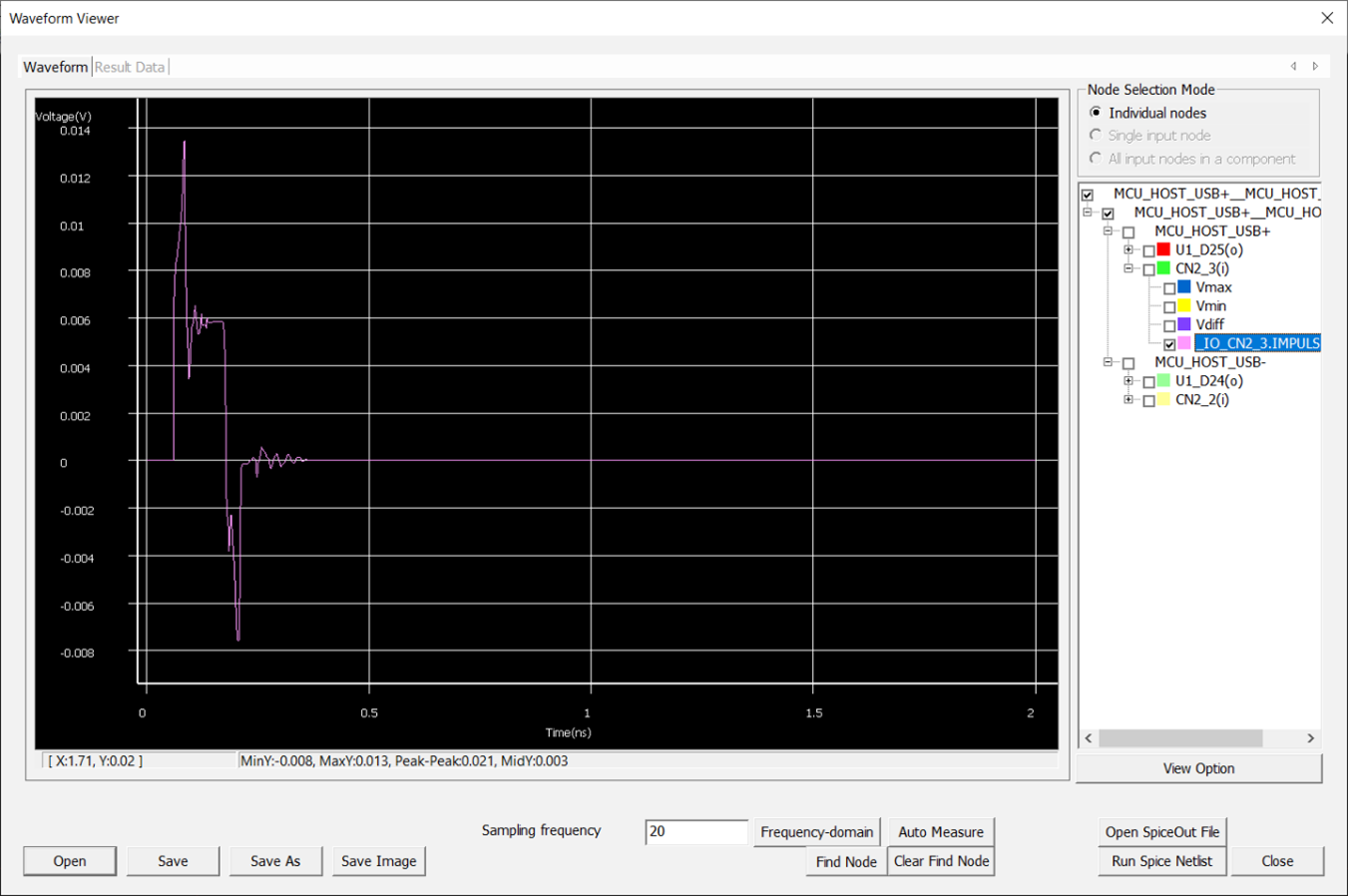 The excitation source signal is applied to the net which is specified by the assigned pin model’s operating characteristics and the values defined at Input Signal and Pulse Period. When the simulation is done, the Waveform Viewer opens or exploring the waveforms.