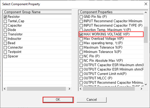 Figure 79. - Enable the Resistor and MAX WORKING VOLTAGE V(P) checkboxes and click OK.
