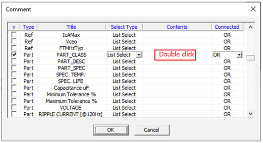 In the Component Property Filter dialog, the new PART_CLASS property is added in the OR section. Tolerance % is added in the AND section of the Component Property Filter dialog.