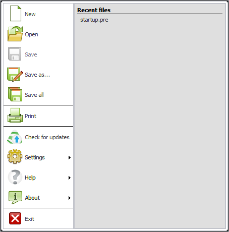 The application menu is similar to a standard file menu of an application. It allows saving and loading of models, print functionality and gives access to application-wide settings.