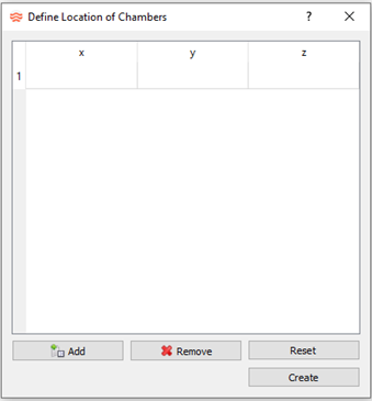 Creates a chamber at the X,Y,Z locations in the table. A table of X,Y,Z coordinates can be copied and pasted into this table from another program (such as a spreadsheet editor).