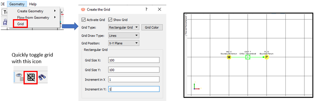 size of 100 screen units. The Grid creation details are controlled from the Geometry > Grid window. The controls in the window include:
