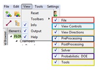 Another way to edit the GUI is to open the “Windows” menu and uncheck unwanted menus. For example, if the user does not wish to see the Variable Edit Tree, IGES List and the Cavity Property Editor, simply closing those Options would suffice. User can use View Menu to enable/disable toolbars & info/output/help tabs.