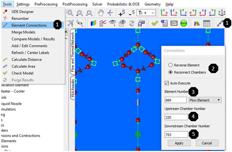 • Note: Users can reconnect chambers using screen operations, If the Reconnect Chambers is selected in Element Connection windows, follow this Mouse left click operations to perform Reconnection, 1st Click on Element, 2nd click on Upstream Chamber & 3rd Click on Downstream Chamber. The elements will be reconnected.