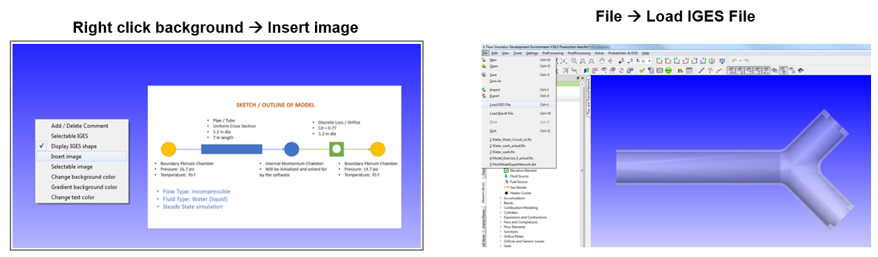 Flow Simulator allows the user to import geometry information in the iges form, as well as any image file. This will help visualize the engineering problem in greater detail.