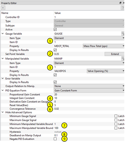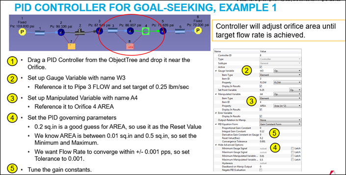 Use the Proportional-Integral-Derivative (PID) Controller to change a model input (the manipulated variable) so that a model result (the gauge variable) matches a user-specified target (a set point). The PID controller can be used for steady state and transient analysis. A PID controller in a steady state analysis behaves like a goal-seek analysis. For instance, use a PID controller to change an orifice diameter to achieve a desired flow rate. A PID controller in a transient analysis can behave like a physical controller device that adjusts a physical component to achieve a specific outcome. For instance, open or close a valve from a cold-water tank to maintain a mixed temperature.
