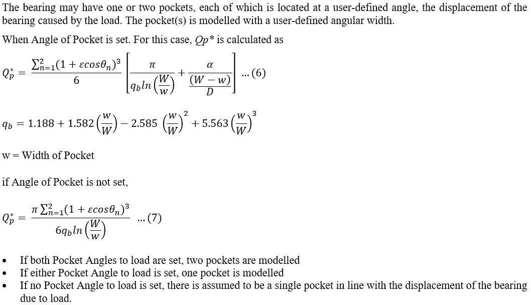 The component simulates a steadily loaded rotating or pivot bearing in a typical engine lubrication system. Its prime use is as a discharge element, which simulates a lubricant feed to the bearing by a pocket within the bearing shell. Pockets are modelled using equation from “Plain bearings - Hydrodynamic plain journal bearings under steady-state conditions - Part 1: Calculation of circular cylindrical bearings” DIN 31652. The model permits a choice of one or two pockets, each of which is located at a user-defined angle to the displacement of the bearing caused by the load.