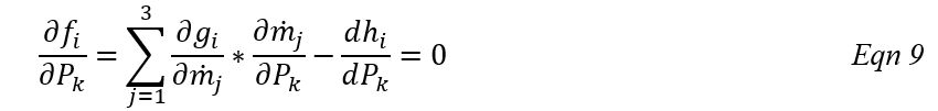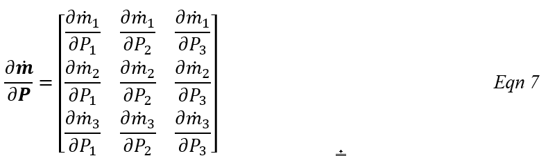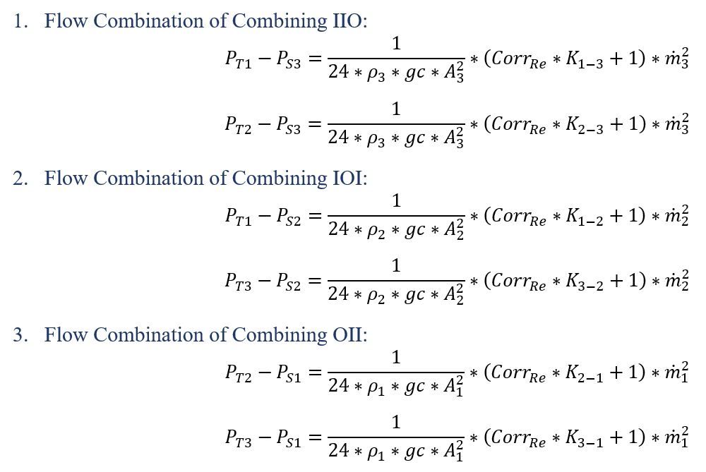 After junction solver is converged to a solution, next step is to calculate another set of derivatives for main solver. If an arm 𝑖 carries incoming flow, then 𝑃 is the total pressure at arm 𝑖. Conversely, if an arm 𝑖 carries exiting flow, then 𝑃 is the static pressure at arm 𝑖. In order to calculate flow derivatives, junction solver constructs a 3x3 matrix from momentum residual equations and continuity equation;