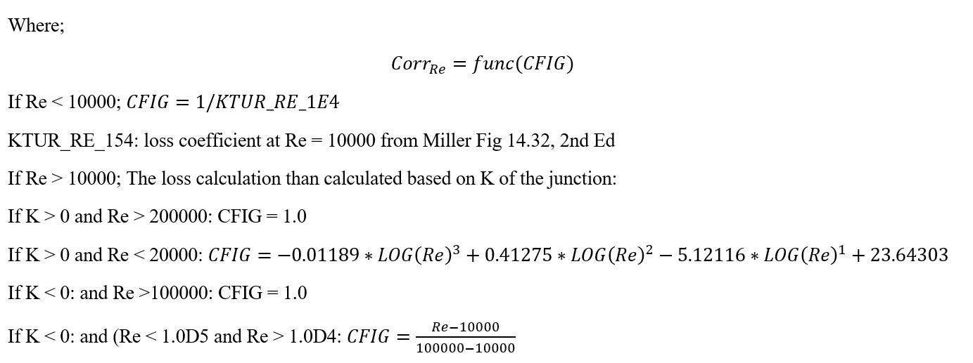 Correction that converts fully turbulent K-loss from experimental data into physical K-loss that occurs for low Reynolds. -1: None 0: User-Specified Curve in CORRECTION vs. REYNOLD_NUMBER table 1: Laminar to Turbulent Loss Correction for Ktur=0.5 (D.S. Miller Internal Flow Systems 2nd Ed. Fig. 14.32) 2: Laminar to Turbulent Loss Correction for Ktur=1 (D.S. Miller Internal Flow Systems 2nd Ed. Fig. 14.32) 3: Laminar to Turbulent Loss Correction for Ktur=5 (D.S. Miller Internal Flow Systems 2nd Ed. Fig. 14.32) 4: Laminar to Turbulent Loss Correction for Ktur=10 (D.S. Miller Internal Flow Systems 2nd Ed. Fig. 14.32) 5: Automatic Fitted Curve for all Ktur (also based on D.S. Miller Internal Flow Systems 2nd Ed. Fig. 14.32) – Not implemented yet |